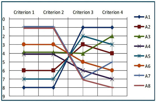 In a model constructed using AHP, sensitivity analysis is a crucial step in determining if the solution is implementable and robust. Such an assessment is undertaken by changing the criteria weight values and calculating the new solution. This so-called One-At-a-Time (OAT) method operates by slightly changing one parameter at a time, calculating the new solution, and graphically presenting how the overall ranking of alternatives consequently changes. Here, the global priority ranking is a function of the global weights of alternatives, which themselves are a linear function of the local contributions, as shown in Equation (2). A desirable sensitivity property is that small local changes in criteria weight values result in very small changes (if any) in the global priority ranking of alternatives.