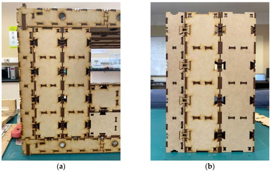 Once the scale model is built, it is decided not to install “End” and “Corner” blocks to save time and material; however, it is observed that there is complexity in connecting the side walls with the rear and front facade. Figure 1 shows the scale model in detail. Therefore, the side piece of the wall was modified, which consists of incorporating the notch for joining with the adjacent wall. In Figure 2, the modification can be observed, which allowed for improved assembly and structural stability of the element.