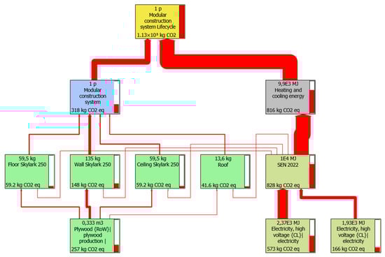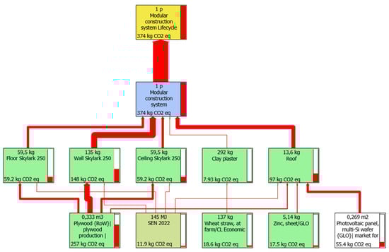 The information regarding the building system, including energy consumption during the usage phase with and without photovoltaic panels, was entered into SimaPro to compare the environmental impact of incorporating energy self-generation systems. Figure 9 presents the diagram of impacts per square meter of the useful surface of the modular building system during a lifespan of 50 years, considering the material production stage, off-site construction, assembly, usage phase without photovoltaic panels, and end-of-life disposal in a landfill, with a total of 1.13 × 103 (KgCO2eq).