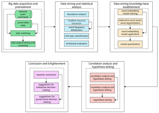 Regarding the research process method, we adopt the research method of hypothesis analysis based on network information and text mining [52,53,54], which is widely recognized and used in academic circles. The research approach is shown in Figure 3, which includes the following main steps: