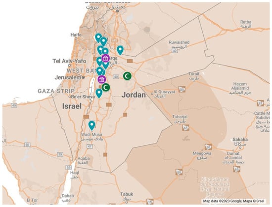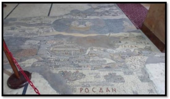 Madaba is 33 km from the capital city of Jordan—Amman (Figure 4); Madaba was an important town at the beginning of the Christian era [41]. Imposing churches were built there, which have well-known mosaic pavements, such as those at St. George’s Church, where the map of Madaba is located (the Holy Land), which dates back to the year 560 AD (Figure 5).