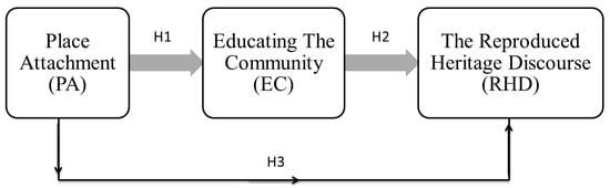Furthermore, the literature suggests the value of replicas comes from their heritage discourse in society, which is created by educating the community, which essentially aims to disseminate the value, significance, and meaning of historical buildings and monuments to ensure increased conservation awareness and appreciation for heritage, which leads to a different view of the social practice of managing heritage replicas [26,91,92]. Therefore, the model suggests that educating the community has a positive impact on the formation of the replicated heritage discourse and prompts replicated heritage consumption in contemporary places. Besides that, Smith [26] pointed out that the attachment to heritage place is a central concept in heritage discourse, which affects heritage consumption and acceptance. So, the model proposes that place attachment has a positive impact on the formation of the replicated heritage discourse, prompting replicated heritage consumption in contemporary places.