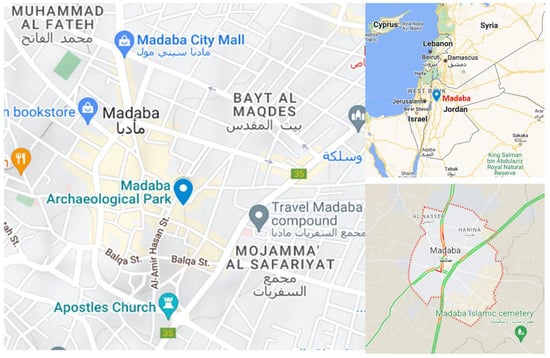 - Madaba—Acor Jordan. Available online: https://acorjordan.org/madaba/ (accessed on 9 July 2022).