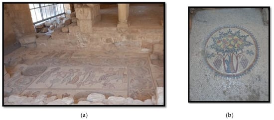 In Jordan, numerous mosaic pavements are preserved today (Figure 1). The earliest Jordanian mosaic panel, which dates to the first century AD, was found in Mukawir Castle (Figure 2). It is displayed on the front facade of the entrances of Madaba’s Archeological Park [40].