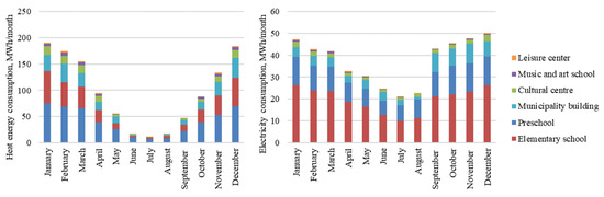 Figure 1 shows the average monthly heat and electricity consumption from 2019 to 2021. The largest energy consumers are the elementary school, preschool, and office building. The largest heat energy consumption is in the heating season, especially in winter. During the summer, the heat energy consumption is for preparing hot water. From September to April, electricity consumption is higher in the preschool and elementary school, but in other buildings the difference in electricity consumption between winter and summer is up to 1 MWh per month.