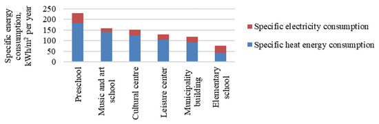 Analysing the specific energy consumption of municipal buildings, the buildings with the highest specific energy consumption are preschool, music and art school, and culture centre buildings (see Figure 2). The preschool and music and art school have the highest specific heat energy consumption, but the elementary school has the lowest. The preschool and primary school have the highest specific electricity consumption, while the music and art school has the lowest specific electricity consumption. On average, the specific electricity consumption is four times lower than the specific heat energy consumption. However, the most similar specific electricity and heat energy consumption is for the elementary school, but the biggest difference in the specific electricity and heat energy consumption is for the music and art school.