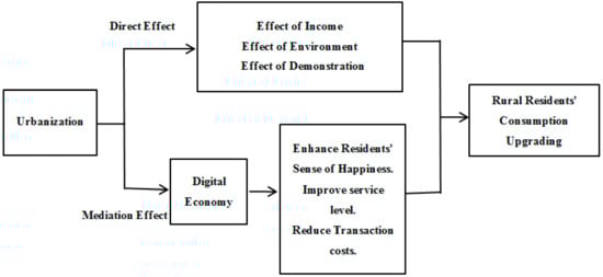 Based on the intermediary effect and threshold effect model, this paper discusses the relationship between urbanization and consumption in rural areas. It is concluded that urbanization development directly affects the consumption of rural residents and that the digital economy plays an important role (see Figure 1).