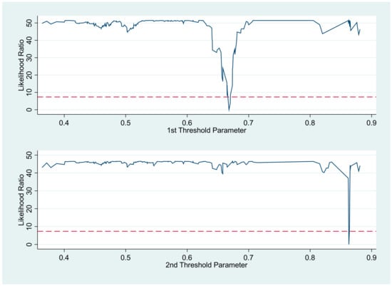 In order to provide more intuitive and detailed test information, this paper presents the confidence interval graph of threshold effect. Figure 2 shows the confidence intervals of the single threshold and double threshold. The horizontal dotted line is 95% confidence. The curve is the line of the search point of each threshold value, and the longitudinal coordinate corresponding to each point on the curve represents the likelihood ratio of the threshold value. The intersection of the curved and dotted line is the confidence interval under the 95% confidence level. The narrower the confidence interval, the lesser the unobservable influence, and the more accurate the threshold estimation.