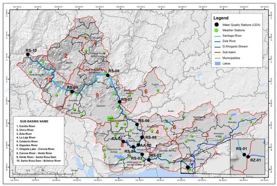 Geographic location of the Santiago–Guadalajara River basin, sub-basins and municipalities, and weather and quality stations of CEA Jalisco (i.e., study area).