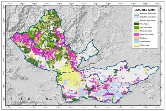 Figure 3 shows the land use and vegetation in the SGRB. The predominant land use is for agriculture, at 45.05%. Rainfed agriculture takes up 36.49% of the total area, followed far behind by irrigation agriculture at 8.37% and, finally, by humidity agriculture at 0.19% [1,18]. The largest area of rainfed agriculture is in the east of the SGRB, from the limits of the Guadalajara to Arandas municipalities (Figure 2). The area surrounding Tequila is also very important. Most of the irrigated agriculture is in the southeastern part of the SGRB north of Lake Chapala [1,18]. Forests (primary and secondary) cover the second-most area (20.09%) and include oak (13.71%), oak–pine (4.76%), and pine–oak (1.62%) forests [1,18]. The forests are predominantly in the northern part of the SGRB. In particular, the pine–oak forests are at the northern boundary. The oak forests have a wider distribution but are also predominantly in the north, with small and isolated patches in the southeast. The oak–pine forests surround the pine–oak forests in the north and center of the basin [1]. Deciduous forest covers the third-most area (14.86%), but most of this is secondary forest (9.96%). Deciduous forest is the most widely distributed among the types of land use and stretches from a very thin west–east strip in the north to the center and south, where it is mostly surrounded by agriculture [1,18]. Pastures (10.6%) cover the fourth-most area and are predominantly induced (10.5%), with the rest natural (0.1%), and they are covered by shrubby secondary vegetation. Grasslands are distributed as patches throughout the SGRB. The largest patches are in the north and are surrounded by forests and jungles (which are under serious threat of deforestation), and the smallest are in the agricultural zone [1,18]. Because of the small areas occupied by hydrophilic halophytic vegetation (i.e., other types of vegetation) (0.01%), no apparent vegetation (0.02%), and water bodies (0.91%), these land-use types were not included in further analysis [1,18]. Urban areas covered the fifth-most area (7.62%). Despite the small surface area, this land use had the greatest impact. The Metropolitan Area of Guadalajara lies at the center of the SGRB [1,18]. Other urban settlements include the cities of Arandas, Atotonilco el Alto, Totolán, Ocotlán, Poncitlán, Zapotlanejo, El Arenal, Amatitán, and Tequila.