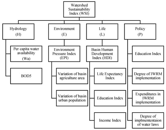 The watershed sustainability index (WSI) was developed by Chaves and Alipaz [15], and it estimates the sustainability of a specific watershed by considering cause–effect relationships and the response to implemented policies. As given in Table 3, the WSI integrates four indices: hydrology (H), environment (E), life (L), and policies (P). Each index is further characterized by three parameters: the pressure, state, and response. The pressure refers to human impacts exerted on the basin over the environment and the natural resources such as flora, fauna, soil, air, and water. The state represents the situation that currently preserves the environment and the natural resources of the basin. The response is a measure of society’s reaction to facing impacts on the environment and natural resources through the implementation of policies or projects to mitigate damages. The pressure–state–response model incorporates cause–effect relationships, so it provides a more general understanding than that provided by an index that only examines a single parameter, such as the state. Figure 5 presents the aggregation stages of the WSI. If each index is given an equal weight, the simplest linear form of the WSI is given by [15].