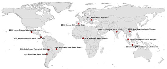 Since Chaves and Alipaz [15] published their work, several authors have adopted and modified their approach to estimate the WSI for specific river basins. In the present study, a careful analysis of the state of the art was carried out by comparing the strategies adopted by different authors to generate WSI values for different river basins. Table 4 indicates that most of the authors followed the basic principles of the original WSI [15], but some added other indices or modified the original [30]. Figure 6 shows the locations of the river basins to which WSI was applied.