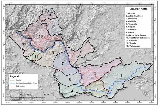 - DOF: 28 de Agosto de 2006. Agreement By which the Result of the Studies of Average Annual Availability of Surface Waters in the Hydrological Basins of the San Pedro Rivers, Calles Dam, Niagara Dam, Cuarenta Dam, Rio de Lagos, Ajojucar Dam, River Is Disclosed Grande, Encarnacion River, Aguascalientes River, San Miguel River, Valle River, Verde River 1, Verde River 2, Palomas River, El Chique Dam, Juchipila River 1, Juchipila River 2, Juchipila River 3, Santiago River 1, Santiago River 2, Santa Rosa Dam, Santiago River 3, Tepetongo River, Tlaltenango River, Lobatos Stream, Bolaños River 1, Bolaños River 2, San Juan River, Atengo River, Jesús María River, Huaynamota River, Santiago 4 River and Santiago 5 River, Same as They are part of the Portion of the Hydrological Region Called Río Santiago. Available online: http://www.dof.gob.mx/nota_detalle.php?codigo=4929122&fecha=28/08/2006&print=true (accessed on 20 March 2023).