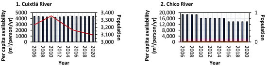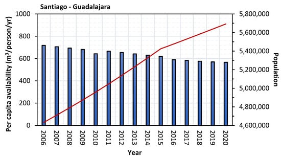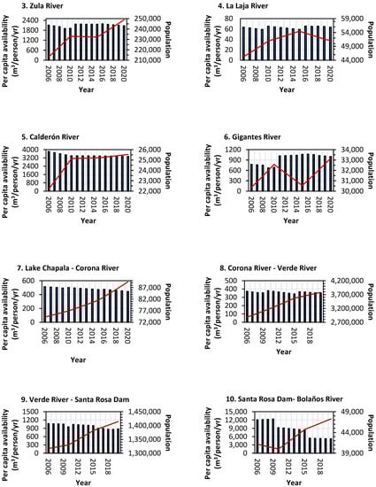 Figure 8 and Figure 9 graph the water availability per capita for the sub-basins and the entire SGRB, respectively, for the study period of 2006–2020. Water availability showed a downward trend over the years. In contrast, the population showed an upward trend for both the sub-basins and the entire SGRB, as shown in Figure 8 and Figure 9, respectively. Seeing both at the same time shows the necessity of improving the water management in the area, with special attention to the Santa Rosa Dam–Bolaños River sub-basin (numbered 10), where the highest drop in water availability is observed. For the sub-basin numbered 2, Chico River, no population data are reported.