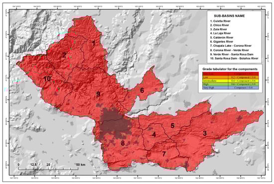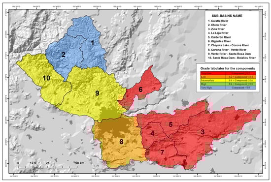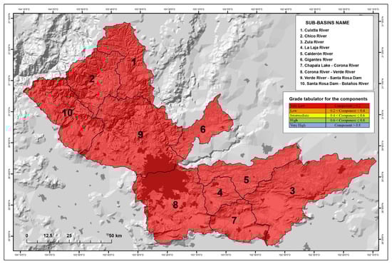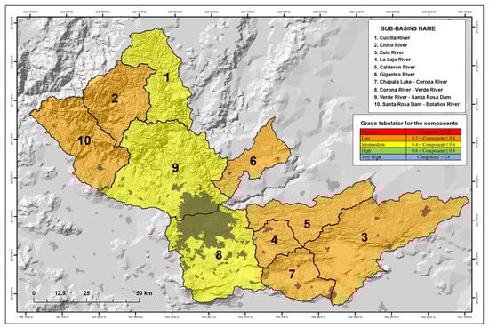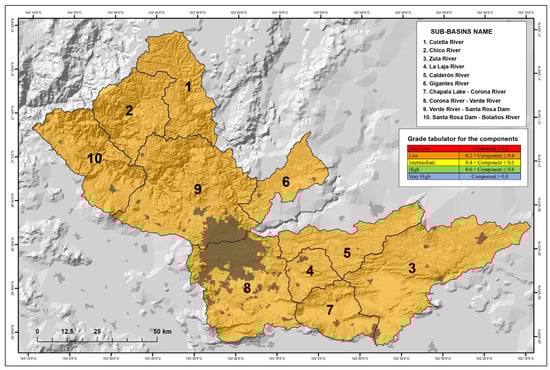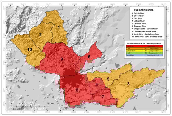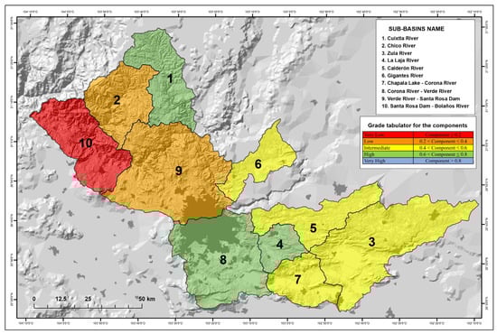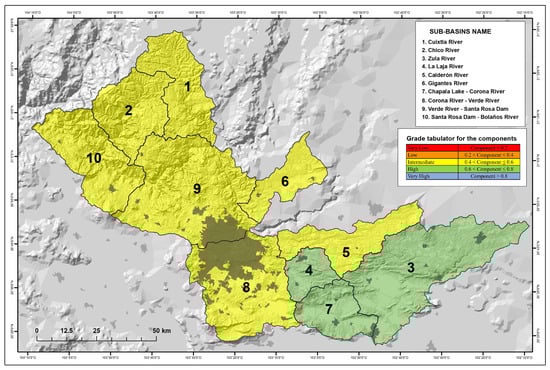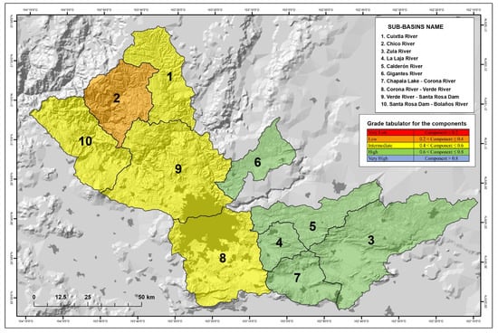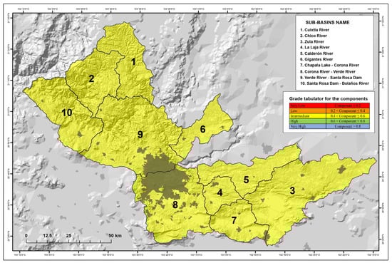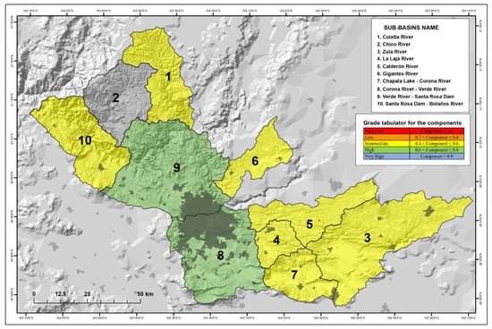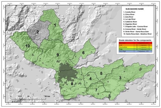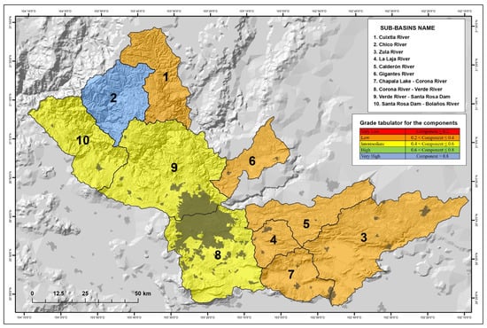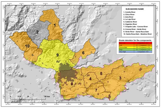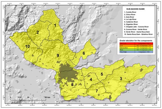 Finally, the WSI of each sub-basin places the SGRB at a sustainability level between low and intermediate (Figure 27). The sub-basins that have a low score are 2. Chico River, 3. Zula River, 4. La Laja River, 5. Calderón River, 6. Gigantes River, 7. Chapala Lake, and 10. Santa Rosa Dam–Bolaños River, while the sub-basins with intermediate scores are 1. Cuixtla River, 8. Corona River–Verde River, and 9. Verde River–Santa Rosa Dam. The sub-basins with a low sustainability level are characterized by environmental degradation due to changes in land use, which has resulted in a loss of areas with natural vegetation due to deforestation, combined with the lack of effective policies to prevent resource loss and promote ecosystem recovery. In addition, the population has been increasing in some of the sub-basins. Specifically, in the sub-basins 2. Chico River and 10. Santa Rosa Dam–Bolaños River, which are in the lower basin, there has been a gradual decrease in water availability during the analyzed period, which also has a negative effect on sub-basin sustainability. In the sub-basins with intermediate sustainability, the factor that most affects the evaluation is water availability, which places the region in a water stress situation, so efforts should focus on generating measures to make more efficient use of water, both in agricultural and urban use.