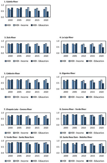 The life index represents the quality of life or human development in the basin. Human development is defined as the equitable expansion of people’s freedom, and it involves increasing the options of those with fewer opportunities. It is not about the mere accumulation of resources but is also about the reduction in restrictions to pursue one’s own objectives [39]. The UN uses the human development index (HDI), which has three basic components: the ability to lead a long and healthy life, which is measured by life expectancy at birth (HDI-Life Expectancy); the ability to acquire knowledge, which is measured by mean and expected years of schooling (HDI-Education); and the ability to achieve a decent standard of living, which is measured by the gross national income per capita (HDI-Income) [57]. Mexico follows UN guidelines and calculates the HDI for each municipality.