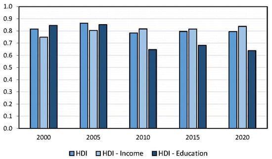 For the policy index, the pressure parameter is evaluated according to HDI-Education, which has a positive correlation with a population’s willingness to become involved in water management and exert pressure on decision makers, as stated in [15]. The state and response parameters are qualitative. The state parameter is evaluated according to the capacity of the basin to incorporate the objectives of integrated water resources management (IWRM). The response parameter is evaluated according to the resources allocated to IWRM in the study period.