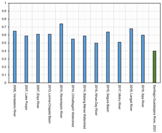 Figure 27 shows the WSI values calculated for each sub-basin where a predominance of intermediate levels is denoted in the middle zone of the basin, the most populated and with the greatest industrial activity, and of low levels in the extreme east and west of the basin, which are agricultural regions or forests. With the aim of estimating a unique WSI for the entire SGRB, the four component indices were averaged, getting a WSI of 0.36 for the period of 2016–2020. Figure 28 compares the WSI value of the SGRB with those of other basins around the world found in the literature.