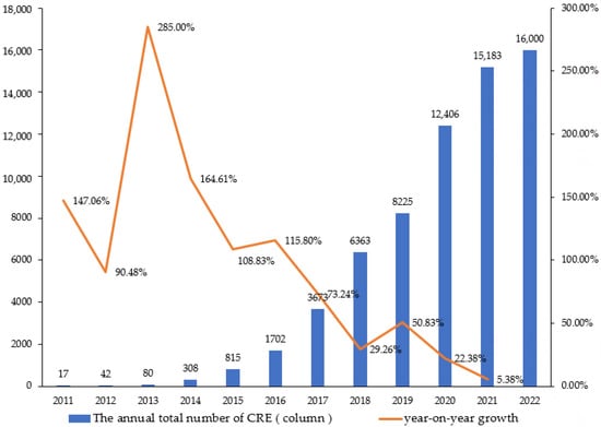According to the China Railway Express Construction and Development Plan (2016–2020), China Railway Express (CRE) is defined as an international intermodal train for transporting containers and other railways running in China, Europe, and countries along “the Belt and Road” with a fixed number of trains, fixed lines, schedules and full running time. Year 2023 marks the 10th anniversary of “the Belt and Road” initiative. As a demonstration project of “the Belt and Road”, after decades of accumulation, the CRE is playing an increasingly important role in international trade. In terms of the scale of operations, the number of CRE operations increased from 17 in the first year of 2011 to 16,000 at the end of 2022, showing a super-rapid development trend; in terms of promoting China–EU economic and trade exchanges, the Chinese government has vigorously developed China–EU bilateral economic and trade exchanges (as shown in Figure 1). In recent years, CRE’s transportation capacity has been continuously improved. In 2018, the transportation of goods was less than one million TEUs, only 541,000 TEUs, but in 2022, the index was as high as 6.04 million TEUs, achieving leapfrog growth. In terms of connectivity with European countries and cities, by the end of 2022, CRE’s network operation range will support the connectivity of 108 domestic cities and 208 cities, effectively expanding the “circle of friends” of the China–EU trade.