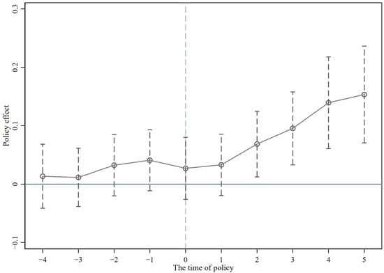 The multi-period DID method requires the experimental group and the control group to have the same growth trend before the implementation of the policy, that is, to meet the parallel trend conditions. In order to test this condition, this paper draws on the research results of Wang and Ge [54], and multiplies the dummy variables of the current and five periods before and after the opening of the CRE with the dummy variables of the experimental group as the core explanatory variables for regression. As shown in Figure 3, the regression coefficients of the core explanatory variables in the current and previous periods of the policy are not significant, indicating that the experimental group and the control group have the same change trend before the opening of the CRE, basically meeting the parallel trend hypothesis. In addition, the regression coefficient after the implementation of the policy in Figure 3 shows a significant upward trend, which reflects that the impact of CRE on regional resource misallocation has certain long-term and stability, and also shows that this effect does not appear immediately.