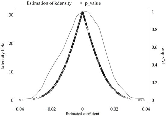Since some unobservable missing variables cannot be controlled as fixed effects, a placebo test is needed to examine whether the changes in the samples after the implementation of the policy are affected by other random factors. Drawing on the practice of Jin and Zhang [55], we randomly selected a year in the sample period as the policy time of the sample object by means of fictitious policy time, and based on this counterfactual sample, we carried out multi-period double difference regression, repeated the above process 500 times, and obtained the coefficient estimation results of the random sample. As shown in Figure 4, the kernel density distribution map basically shows a normal distribution. The estimation coefficients of the dummy variables of the random sample policy are mostly distributed near 0, and the p value is greater than 0.1, indicating that the estimation results of the random sample are not significant and there is a big difference between the estimation results of the real sample. There is no significant estimation error caused by missing variables. The main conclusions of this paper have good robustness.