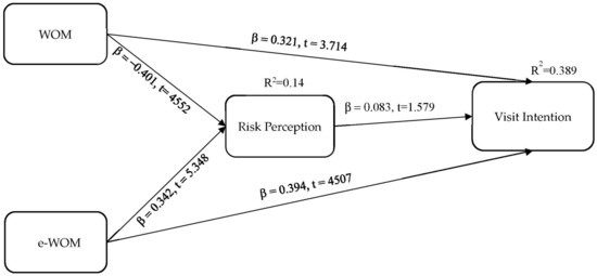 Table 8 shows the result of the structural equation model of the study. Table 8 presents that Hypothesis 1 was supported in this study (βWOM → Risk perception = −0.401, p = 0.000). Hypothesis 2 was accepted or significant (βe-WOM → Risk perception = 0.342, p = 0.000). Hypothesis 3 was accepted in this study (βWOM → visit intention = 0.321, p = 0.000). Furthermore, this study did not support the hypothesis of (βrisk perception → visit intention = 0.083, p = 0.114). The last hypothesis in this study (βe-WOM → visit intention = 0.394, p = 0.000) or the hypothesis was supported in this study. Therefore, the variance explained or R square by presence word of mouth, electronic word of mouth, and risk perception were 0.140, and WOM, e-WOM, and visit intention were 0.389, respectively. Figure 2 shows the result of PLS-SEM.