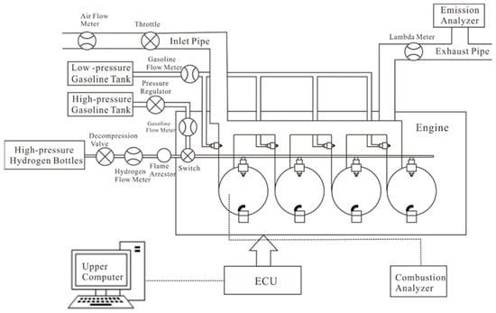 The prototype engine was an in-line four-cylinder water-cooled spark-ignition direct injection (SIDI) engine, which originally had two injection systems, one direct injection system, and one port injection system. The cylinder head was furnished with centrally mounted spark plugs and direct injectors situated between intake valves. Port injectors were arranged on intake manifolds. Table 1 lists the detailed specifications of the prototype engine. The injection timing and duration for both gasoline and syngas were controlled with a self-developed ECU that can also adjust the throttle position and ignition timing. The syngas used in this experiment was hydrogen-rich syngas with fixed 85% H2 and 15% CO by volume to eliminate interferences [31,32]. The specifications of the gasoline and syngas are shown in [28] and [33]. To maintain the operating state with a fixed excess air ratio (λ), the requested fuel distribution ratio was obtained through the precise monitoring of the airflow, syngas flow, and gasoline flow. Moreover, due to the wide flammability of hydrogen, a flame arrestor was installed within the hydrogen supply line to avoid backfire. Figure 1 illustrates the overall schematic layout of the experimental system.