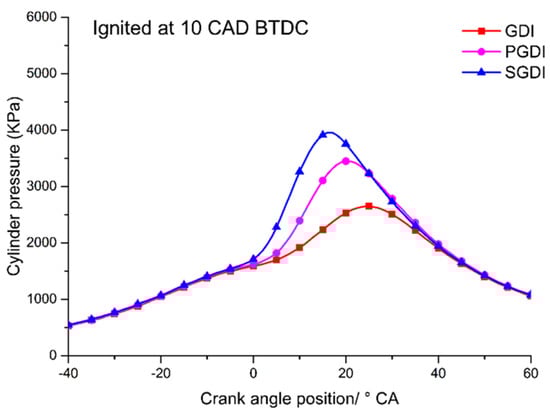 In-cylinder pressure. Spark timing set at 10 CAD BTDC for 3 kinds of injection modes.