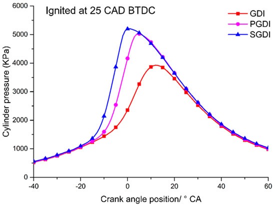 Figure 2 and Figure 3 plot the in-cylinder pressure for the three kinds of injection modes with spark timings at 10 CAD BTDC and 25 CAD BTDC. The cylinder pressures for PSDI show the highest cylinder pressure, while GDI presents the lowest value in both figures. Firstly, investigating the injection configuration and then analyzing the fuel properties indicated some detailed effects among the three injection modes. Port fuel injection has more time to form a homogenous mixture beneficially, and the direct injection portion can achieve stable and reliable ignition, so the combustion efficiency and cylinder pressure can be increased with combined fuel injection. This conclusion is similar to that in [39], which mainly focuses on fuel consumption and half-load performance. Furthermore, as syngas has a high laminar flame speed that can enhance the constant volume combustion degree, and its small quenching distance also facilitates more complete combustion, the cylinder pressure of PSDI performs higher than that of PGDI.
