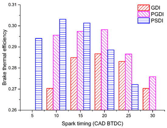 Figure 4 plots the brake thermal efficiency (BTE) at various spark timings for three kinds of injection modes. As the minimum spark advance for best torque (MBT) for GDI and PGDI is 20 CAD BTDC, while the MBT for PSDI is only 10 CAD BTDC, the investigated ranges of ignition timings had a slight difference. When the spark timing was set at the MBT, PSDI demonstrated the highest maximum BTE (30.3%), while GDI showed the least maximum value (28.7%), and the maximum BTE of PGDI was 29.8%. The maximum BTE increased by 1.6% from GDI to PSDI. PGDI can form a more homogeneous mixture, producing complete combustion and higher BTE. As syngas has high diffusive efficiency and low ignition energy, the homogenous condition was further enhanced, and the requirement for combustion declined. These factors are all beneficial for complete combustion, which is critically beneficial for BTE. Moreover, a high laminar burning velocity shortens the combustion period and reduces heat transfer loss. As such, PSDI has higher BTE than GDI because of more complete combustion, higher combustion efficiency, and less heat transfer loss.