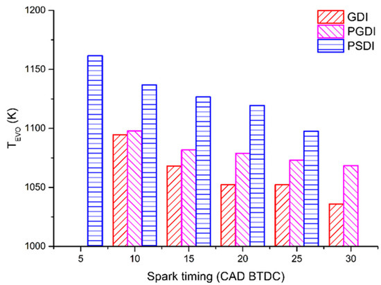 Figure 5 shows the cylinder temperature at the exhaust valve opening (TEVO) versus the spark timings for the three kinds of injection modes. The TEVO reflects the engine post-combustion and exhaust loss to some extent [40]. The cam phasing was fixed just as the original engine and the exhaust valve opened at 26 CAD before the bottom dead center (BBDC). The TEVOs for the GDI and PGDI modes are relatively similar, and the TEVO for the PSDI mode is substantially higher than those for the other modes. The exhaust temperature for PSDI shows the highest value because of the fast burning velocity and higher maximum cylinder pressure. The TEVO mainly affected the emissions characteristics, and the details will be discussed in Section 3.3.