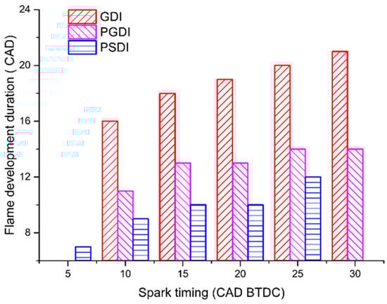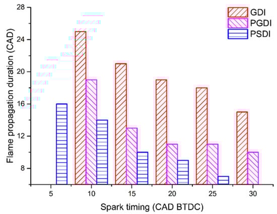 Figure 6 plots the flame development duration (0–10% mass fraction burned; CA 0–10) at various spark timings for the 3 kinds of injection modes, and Figure 7 plots the flame propagation duration (10%–90% mass fraction burned; CA 10–90). PGDI shows a shorter duration for both CA 0–10 and CA 10–90 than GDI, and PSDI demonstrates the shortest durations for both parts. The combined injection mode can form a more stratified mixture than the pure GDI mode, which eases the formation of the flame kernel and accelerate the whole combustion period, so PGDI indicates shorter combustion durations. According to previous studies, adding hydrogen to methane and ethanol stimulates the formation of O, OH, and H radicals, which are kinds of improvers for chain reactions [41,42]. The syngas used in this investigation was hydrogen-rich, so it inherited some hydrogen characteristics, and gasoline is a kind of hydrocarbon fuel that is chemically similar to ethanol and methane. Thus, the formation of radicals stimulated via syngas accelerates combustion and shortens the combustion period. A shorter CA 0–10 means more stable combustion, while a shorter CA 10–90 means the combustion process is closer to the constant volume process, allowing higher thermal efficiency [43]. Hence, it is further certified that PSDI has the most stable combustion and the highest thermal efficiency among the three injection modes. On the other hand, by advancing the ignition timing, CA 0–10 was prolonged while CA 10–90 was shortened for all three injection modes. Advancing ignition deteriorates the initial condition for forming the flame kernel, and CA 0–10 is prolonged. Retarding ignition expands the degree of post-combustion, and the combustion at this stage is mainly diffusion combustion with a low burning rate. Thus, the CA 10–90 duration is extended by retarding the ignition timing.