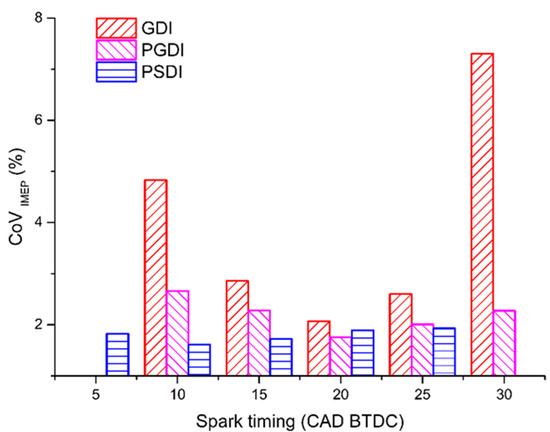 Figure 8 plots the coefficients of variation (CoVs) in the IMEP at various spark timings for the three kinds of injection modes. The CoVIMEP of GDI is dramatically higher than those of the other two modes, and it is very sensitive to spark timings. Specifically, the minimum CoVIMEP of PSDI decreases by 22% from the minimum CoVIMEP of GDI. Many investigations have indicated that a short combustion duration helps to ease an engine’s cyclic variations [44]. It is seen in Figure 6 and Figure 7 that the combustion duration of GDI is obviously long, leading to a high CoVIMEP. Figure 8 also indicates that the CoVIMEP reaches its lowest value at around the MBT point.
