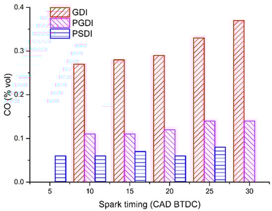 Figure 9 plots CO emission at various spark timings for the three kinds of injection modes. GDI emits the highest CO emission, while PSDI emits the least. CO emissions were reduced by approximately 78% from GDI to PSDI among the whole range of spark timings. However, a 15% volumetric fraction of the syngas used in this experiment was CO, and the CO emission still shows the least value for PSDI, which further certifies that PSDI is beneficial for complete combustion and shows better stability. Ji C. et al. concluded that adjusting the spark timing has no clear effect on the CO emission of a hybrid hydrogen–gasoline engine [45], which agrees with the PSDI profile. CO emission decreased by retarding ignition for the GDI and PGDI modes, as the prolonged post-combustion induced by retarding ignition enhances the oxidation of CO.