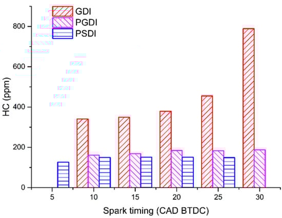 As is shown in Figure 10, GDI emits the highest HC emission, and PGDI and PSDI only emit small amounts. HC emissions were reduced by approximately 60% from GDI to PSDI with a 20 CAD BTDC spark timing. This is because the combined injection mode improves combustion completeness, which reduces the sources of HCs. For the GDI mode, HC emission decreased by retarding ignition, the reason for which could be ascribed to the enhanced oxidizing process caused by prolonged post-combustion and increased TEVO.