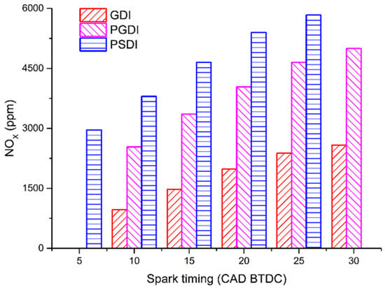 Figure 11 plots the NOX emissions at various spark timings for the three kinds of injection modes. PSDI produced the highest NOX emission, whereas GDI produced the lowest NOX emission. Specifically, the NOX emission from GDI was 44% and 32% of that of PGDI and PSDI, respectively. The main factors affecting NOX emissions include the oxygen fraction, cylinder temperature, and reserved time for high-temperature reactions [46]. As the data in Figure 11 show, PSDI still has a high NOX emission problem. However, as syngas direct injection avails stable combustion, lean-burn combustion and exhaust gas recirculation (EGR) technologies could be used to reduce NOX emissions without causing much damage to the engine performance according to [47]. Figure 11 also indicates that retarding ignition linearly reduces NOX emissions. This is because retarding ignition decreases the maximum cylinder temperature, which is a critical factor for NOX emission.