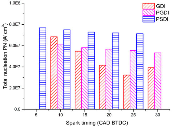 Total nucleation-mode PNs versus spark timings for three kinds of injection modes.