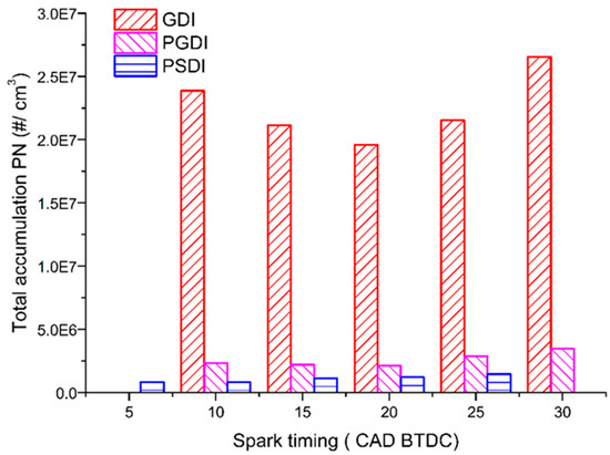 Particulate emissions are a common issue for SIDI engines, and SIDI engines always have high particulate numbers relative to diesel engines, so the particulate emission numbers will be focused on herein. Figure 12 plots the total nucleation-mode PNs at various spark timings for the three kinds of injection modes, and Figure 13 shows the total accumulation-mode PNs for the three kinds of injection modes. Particles in nucleation mode are typically composed of volatile organic and sulfur compounds that form during exhaust dilution and cooling. Meanwhile, particles in accumulation mode are mainly made up of carbonaceous agglomerates and associated adsorbed materials [48,49,50].