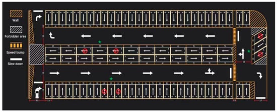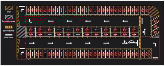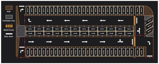 The indoor parking lot of a shopping mall in Xuanwu District, Nanjing, is selected as the reference model for this study, as shown in Figure 2. There is one entrance and two exits in the parking lot. The parking spaces are numbered from 1 to 85 and arranged counterclockwise from the periphery to the inner periphery. The lane width is 5.5 m. The types of parking spaces include parallel, perpendicular, and angled parking spaces. The orange diagonal lines are the parking walls, and the white diagonal lines are the no-parking areas with other uses.