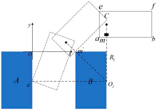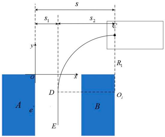 The relationship between the turning radius and the value of the horizontal coordinate of the initial position of the vehicle starting to reverse into the arc of and the width of the parking space can be obtained by combining Equations (28)–(30), as shown in Equation (31).