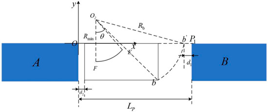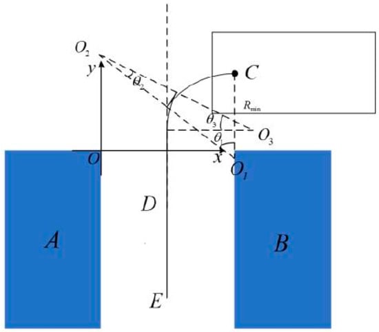 In order to reduce the possibility of the vehicle in the parking process and parking space edge or road edge and other obstacles’ edge collision, in the analysis of the vehicle driving trajectory, the obstacles to add a safety distance are considered, and from the analysis of the minimum turning radius, parking space width, and other geometric factors, there is a certain value relationship, as shown in Equation (36).