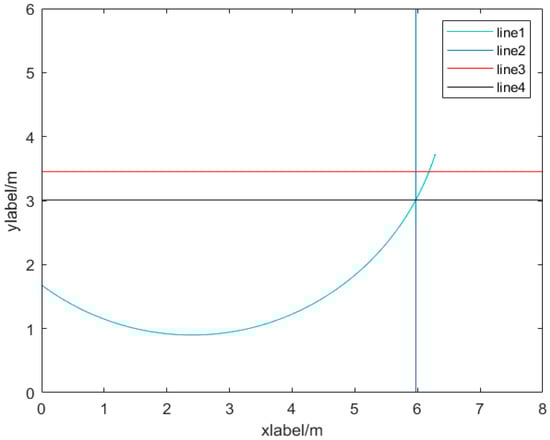 According to the spatial situation of the parking lot, the starting area where the vehicle may temporarily stay before parking is delineated using the parking space to be parked as the reference system, and four different boundary lines are determined based on the above boundary conditions for calculation, as shown in Figure 7. The expression of boundary line 1 is , the expression of boundary line 2 is , the expression of boundary line 3 is , and the expression of boundary line 4 is y = 3.01. When the vehicle is initially in the area below boundary line 4, the parking operation cannot be completed by one-step parking due to the limitation of parking space size, and the parking can only be completed by three-step parking. The vehicle can be parked in one step only when the vehicle control point position is located in the sector-like area enveloped by boundary line 1, boundary line 2, boundary line 3, and boundary line 4.