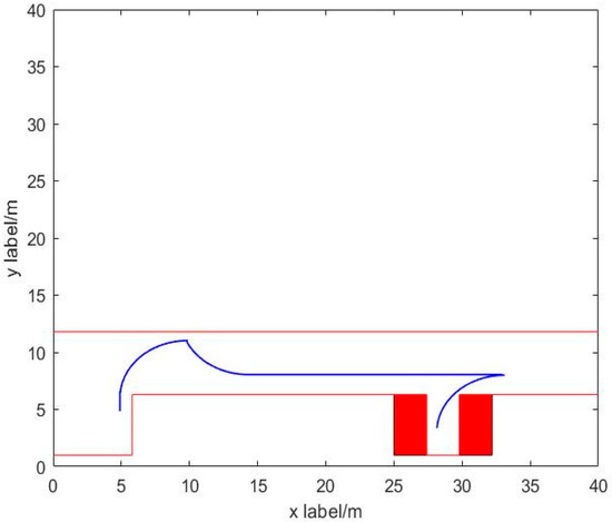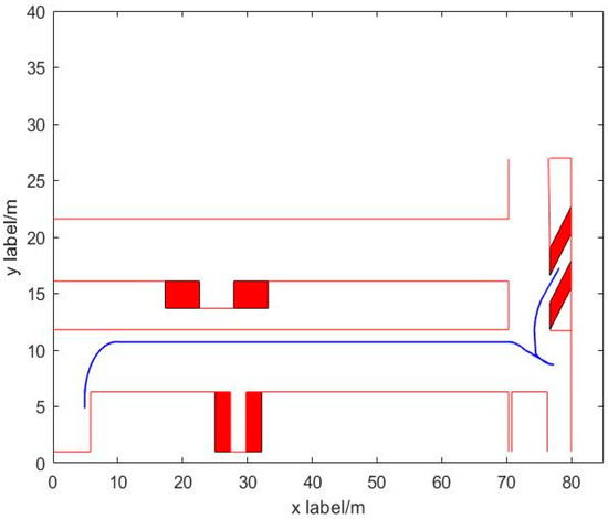 The vehicle parameters are as follows: body length of 4.9 m and width of 1.8 m; car wheelbase of 2.8 m and wheel spacing of 1.7 m; maximum acceleration of 3.0 m/s, maximum deceleration limit of −6.0 m/s2, and acceleration of no more than 20.0 m/s3; steering wheel maximum angle of 470°, steering wheel and front wheel angle of transmission ratio of 16:1 (steering wheel rotation 16°), maximum steering wheel rotation angle of 470°, ratio of the steering wheel to front wheel rotation of 16:1 (steering wheel rotation 16°, front wheel rotation 1°), and maximum speed of the steering wheel of 400°/s.