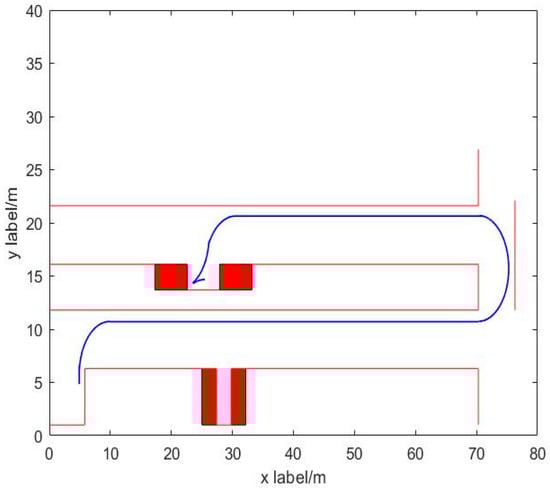 For the three-step vertical parking path planning, given the limitation of parking space size and shape, the minimum turning radius is utilized as the radius of the circular arc trajectory when the vehicle reverses into the parking space, as shown in Figure 5. The vehicle quickly turns the steering wheel to the maximum turning angle from the starting position at the maximum steering wheel speed to drive in reverse. When the control point of the vehicle, i.e., the center point of the rear axle, reaches the center axis of the 10th parking space, the vehicle no longer runs in reverse, but turns the steering wheel rapidly to the maximum turning angle at the maximum speed in the direction opposite to that of the backward direction for forward driving until the point , and again turns the steering wheel rapidly to the maximum turning angle at the maximum speed to drive in reverse until the control point of the vehicle reaches the tangent to the center point of the rear axle. When the vehicle control point of the vehicle reaches the point , which is tangent to the center point, turn the steering wheel to return to the original position, and the vehicle then moves in a straight line in the vertical direction along the center axis of the parking space until it reaches the target parking point.