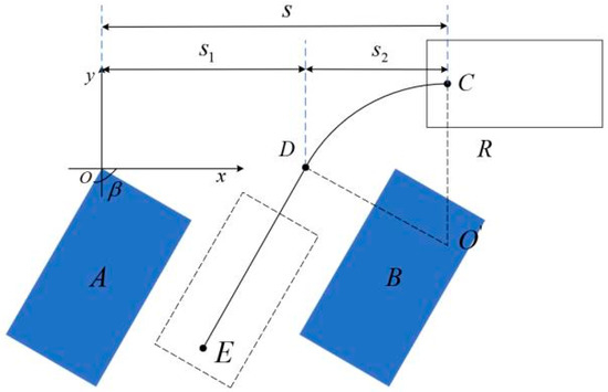 For the vehicle from the parking space entrance along a straight line, then through the arc trajectory into the horizontal section, and then forward a distance after the vehicle’s control point to the right edge of the parking space with 11 in the same horizontal position. It began to reverse along the arc into the parking space and then along the straight line, it went forward a distance to the target parking position of such a reverse process using reverse thinking as shown in Figure 4, in order to facilitate the solution of the vehicle parking trajectory problem, simplify the complexity of the model, and give priority to the car in a straight line and arc on the reverse motion process; remember that the arc endpoints do not meet the endpoint of a straight line for the initial position.