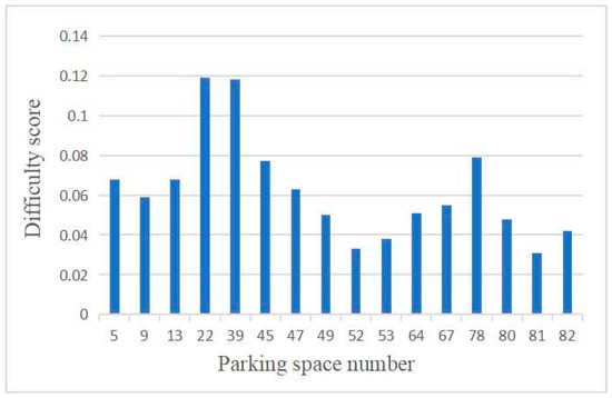 From Figure 17, the parking difficulty score shows that parking space 81 has the smallest comprehensive parking difficulty score and the lowest difficulty coefficient. Under the situation that vehicles enter and leave the parking lot every hour and each parking space will be occupied or released randomly, parking space 81 is the optimal parking space under the dynamic change of parking space occupation. The parking assistance system will indicate to the car owner that parking space 81 is the best parking space.