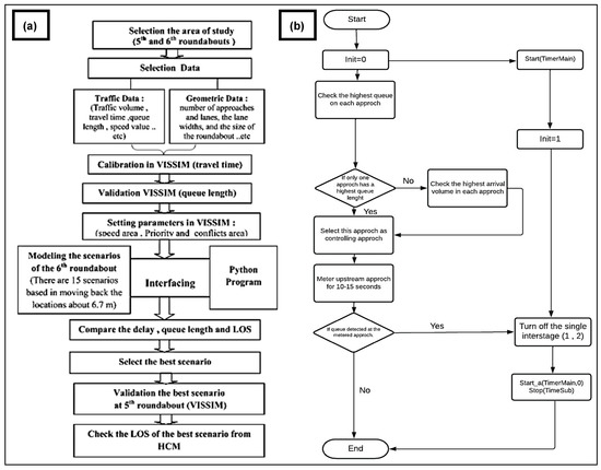 Research methodology (a) modeling of queue detector location and (b) the Python flow chart for stages 1–2.