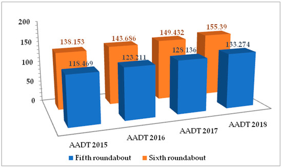 The average annual daily traffic (1000 vehicles/day) for the selected roundabouts between 2015–2018 (GAM, 2018).