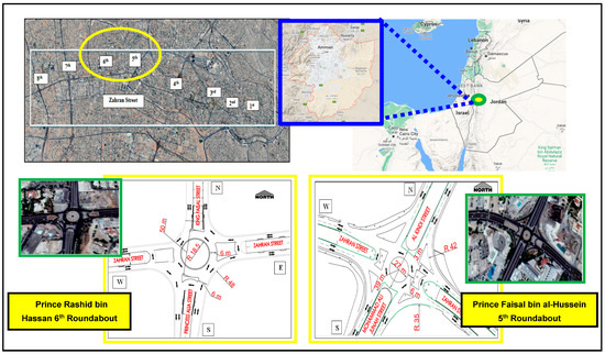 As a case study, Amman, Jordan’s capital city, is a hub of business activities. Zahran Street is a significant street that connects major business districts in the city, resulting in high traffic volumes and severe congestion, particularly during the morning rush hour. This street comprises eight roundabouts, which are among the most congested roundabouts in Amman. The sixth roundabout, Prince Rashid Bin Hassan, and the fifth roundabout, Prince Faisal Bin al-Hussein Square, are the most congested. The Greater Amman Municipality (GAM) has estimated that the traffic volume growth rate at these roundabouts is 3% per year, based on historical data. Therefore, this study offers a viable solution to improve the overall performance of roundabouts and mitigate traffic congestion, particularly in the two most heavily congested roundabouts in Amman. These roundabouts are located in a bustling commercial district, replete with numerous restaurants, cafes, and entertainment venues, as well as banks, insurance companies, and hotels. Additionally, the surrounding area is renowned as one of the most affluent neighborhoods in Amman city. Despite their location, both roundabouts suffer from long queues and high delays on all approaches, particularly during peak periods. These issues are a result of unbalanced traffic flow and high demand, leading to traffic jams, accidents, and decreased entry capacities of the roundabout approaches as more vehicles enter the circulating lane, creating a bottleneck at the roundabout entrance.