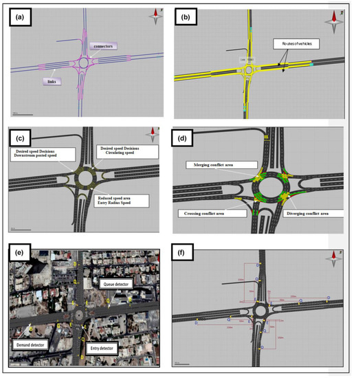 Simulated model in VISSIM at the sixth roundabout: (a) links and connectors; (b) routes of the initial model; (c) the types of speed in the model; (d) the types of conflict areas; (e) the types of detectors in the model; and (f) Scenario 1 at the sixth roundabout.